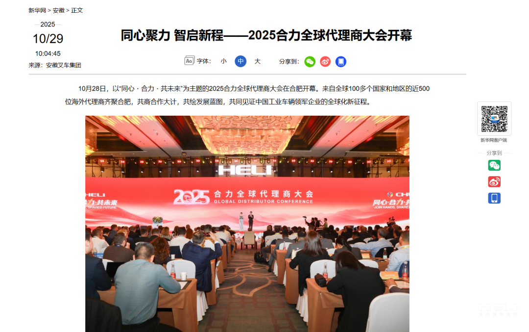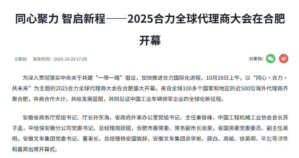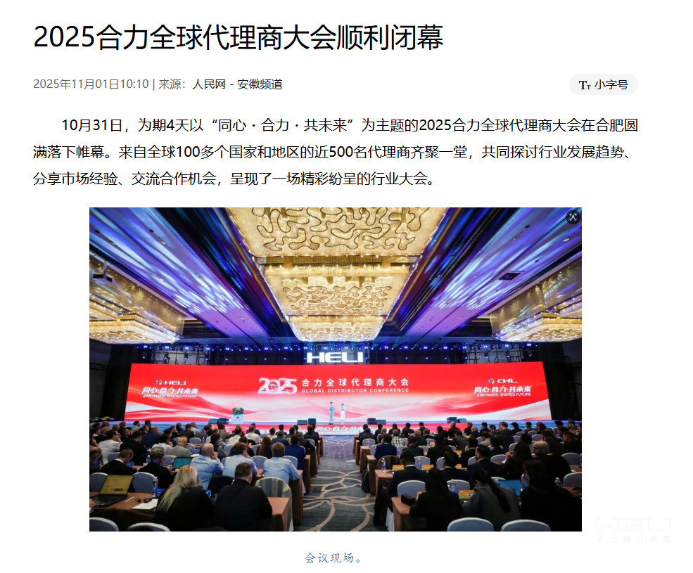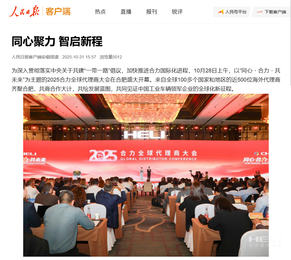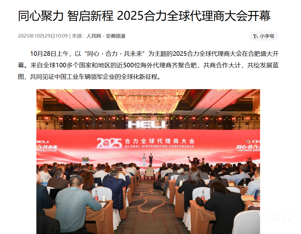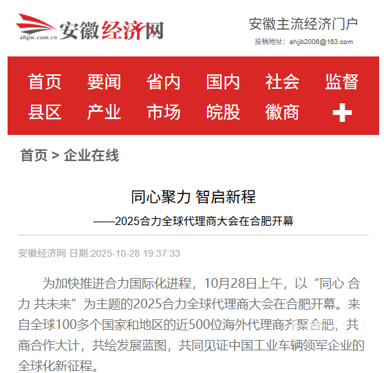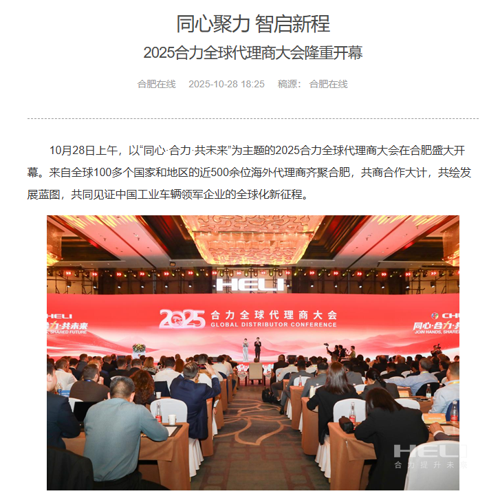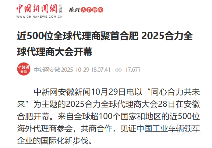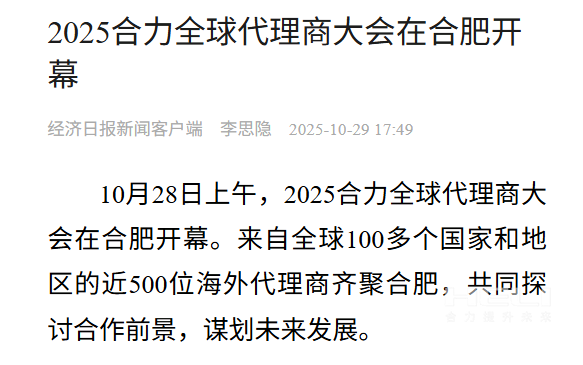 10月28日至31日,“同心?合力?共未來”2025合力全球代理商大會在合肥召開,引發(fā)媒體廣泛關注,新華社安徽分社、中央廣播電視臺安徽總站、經濟日報、證券日報、央廣網、中國工業(yè)報、人民網安徽頻道、新華網安徽頻道、安徽日報、安徽新聞聯播等28家媒體、46名記者蒞臨現場。中央、省內外及香港、行業(yè)媒體競相報道或轉載報道,內容涵蓋戰(zhàn)略發(fā)布、智能成果及全球化布局,形式多元、視角鮮活,立體展現合力“智能+綠色”發(fā)展新動能,奏響高質量發(fā)展強音。