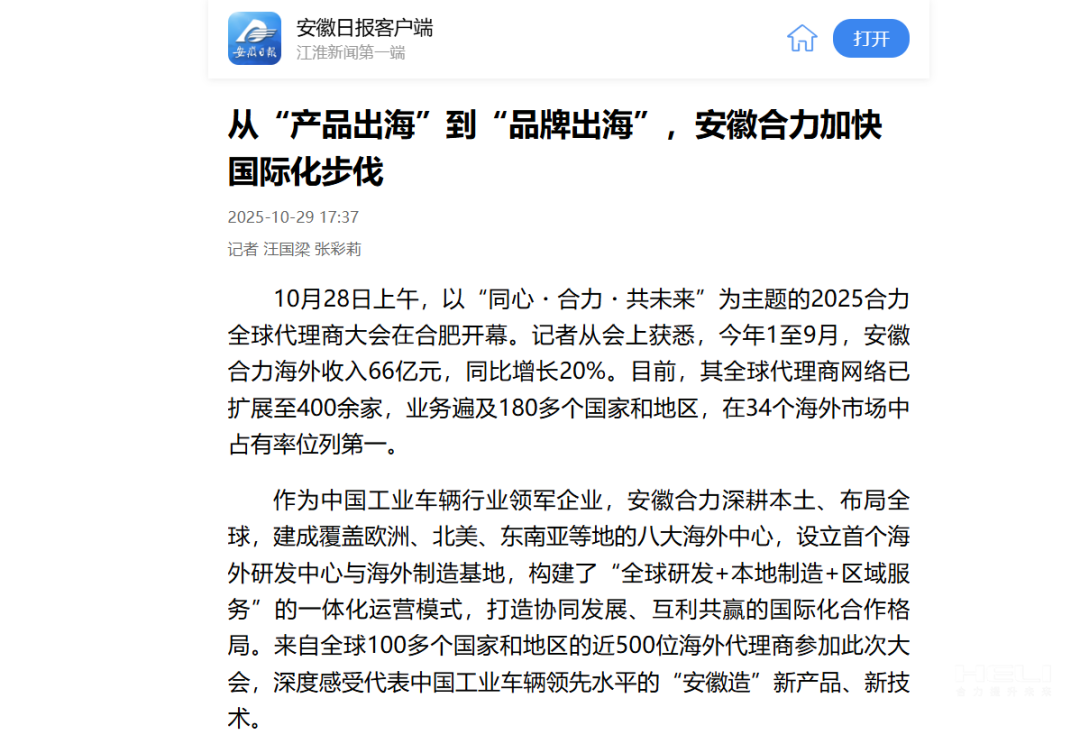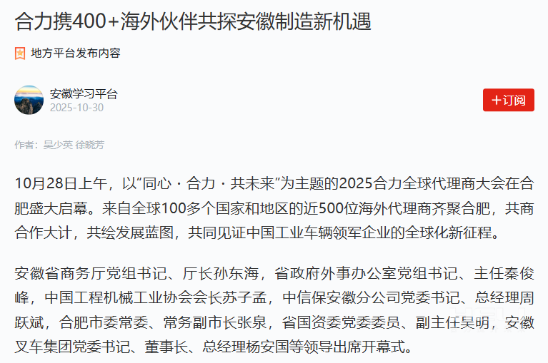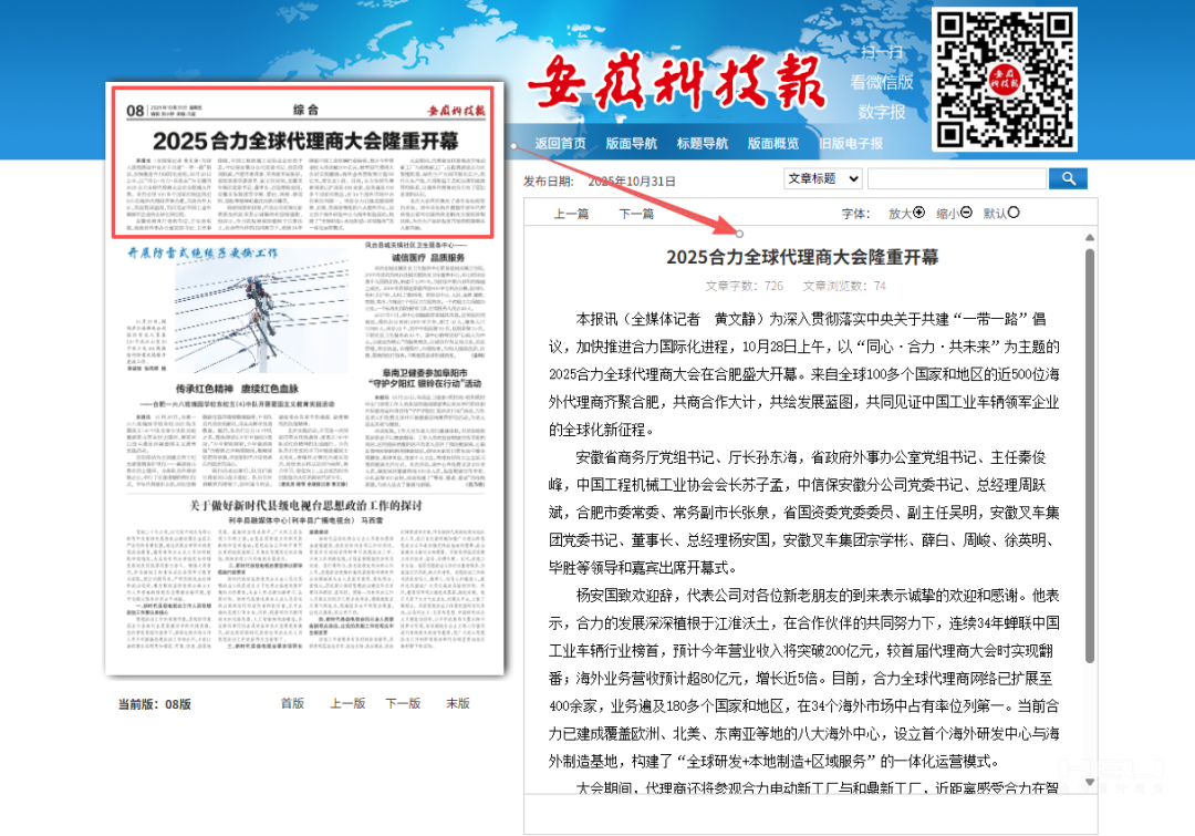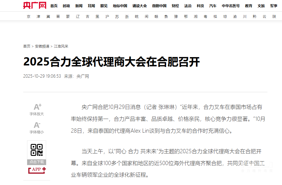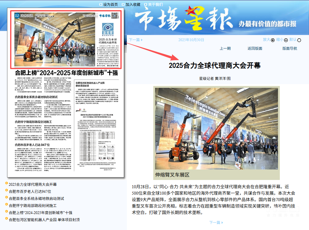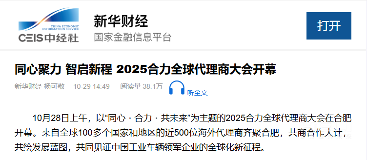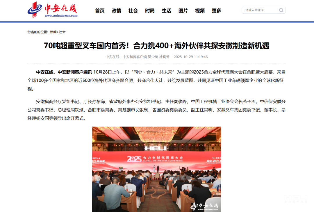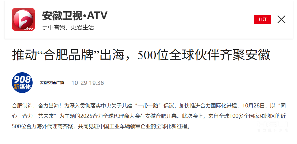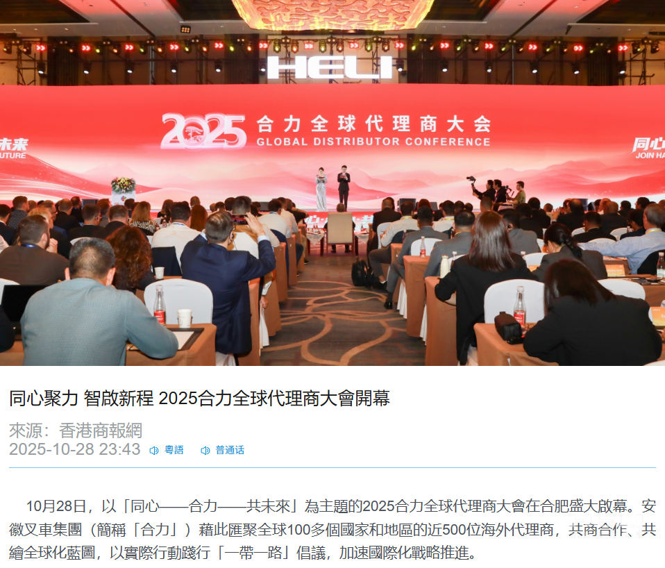10月28日至31日,“同心?合力?共未來”2025合力全球代理商大會在合肥召開,引發(fā)媒體廣泛關注,新華社安徽分社、中央廣播電視臺安徽總站、經濟日報、證券日報、央廣網、中國工業(yè)報、人民網安徽頻道、新華網安徽頻道、安徽日報、安徽新聞聯播等28家媒體、46名記者蒞臨現場。中央、省內外及香港、行業(yè)媒體競相報道或轉載報道,內容涵蓋戰(zhàn)略發(fā)布、智能成果及全球化布局,形式多元、視角鮮活,立體展現合力“智能+綠色”發(fā)展新動能,奏響高質量發(fā)展強音。